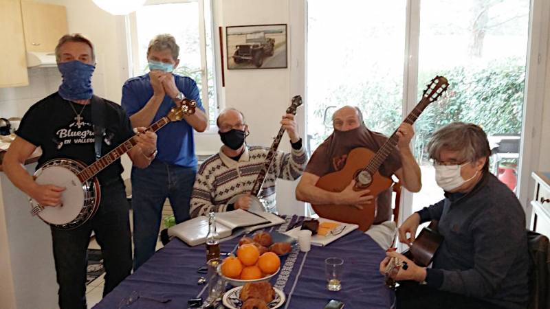 N’étant pas des pros de la visio-conférence, les p’tits gars de Bluegrass en Vallespir ont préféré les sessions en « présentiel » tout en respectant les codes de bienséance en vigueur en ces jours pandémiques.