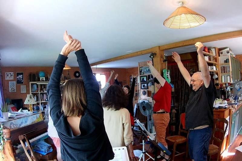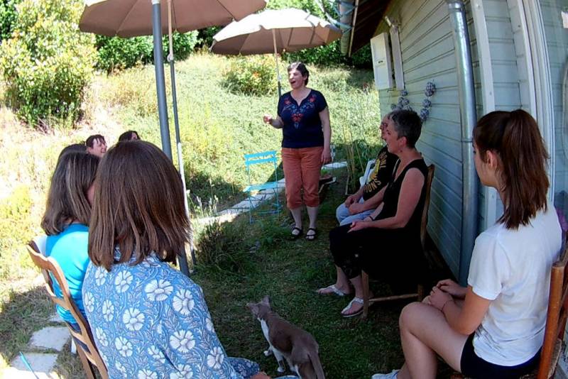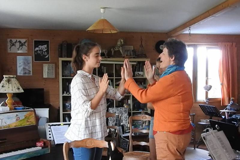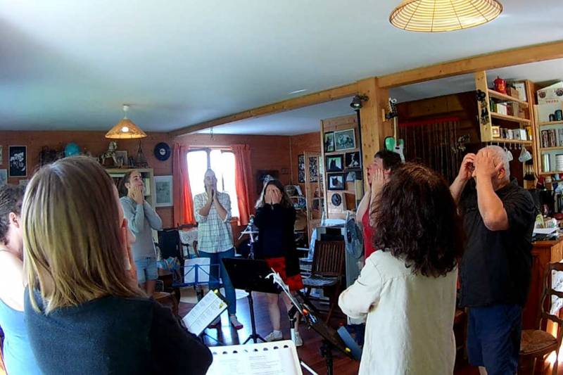 Les échauffements, auxquels elle apporte un soin particulier, ont permis à tout un chacun d'entrer dans le jeu en douceur, mais surtout de (re)prendre conscience de tout ce qui entre en jeu, au niveau corporel, pour le bon déroulement, le confort de l'interprète et la qualité du chant.