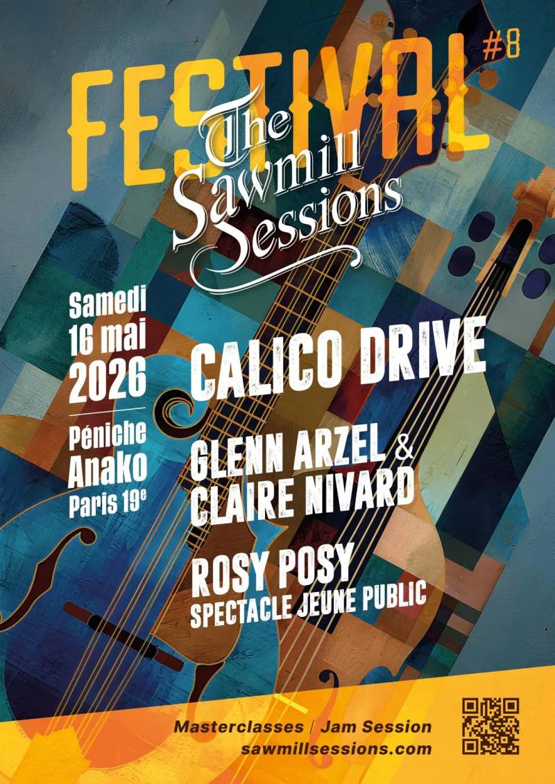 La 8e édition du festival des Sawmill Sessions se tiendra le samedi 16 mai 2026 dès 14h sur la Péniche Anako (Paris 19e). Au programme : masterclasses fiddle et guitare avec les membres de Calico Drive, concert illustré pour un public dès 8 ans, concerts et jam.