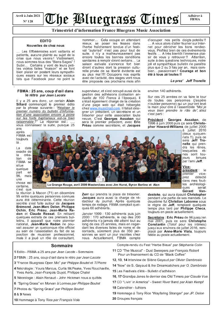 Avril mai juin 2021. Extraits de ce numéro du Bluegrass Times en libre consultation. Si vous appréciez sa qualité éditoriale, adhérez à France Bluegrass Musique Association, vous recevrez gratuitement l'édition numérique à chaque parution.